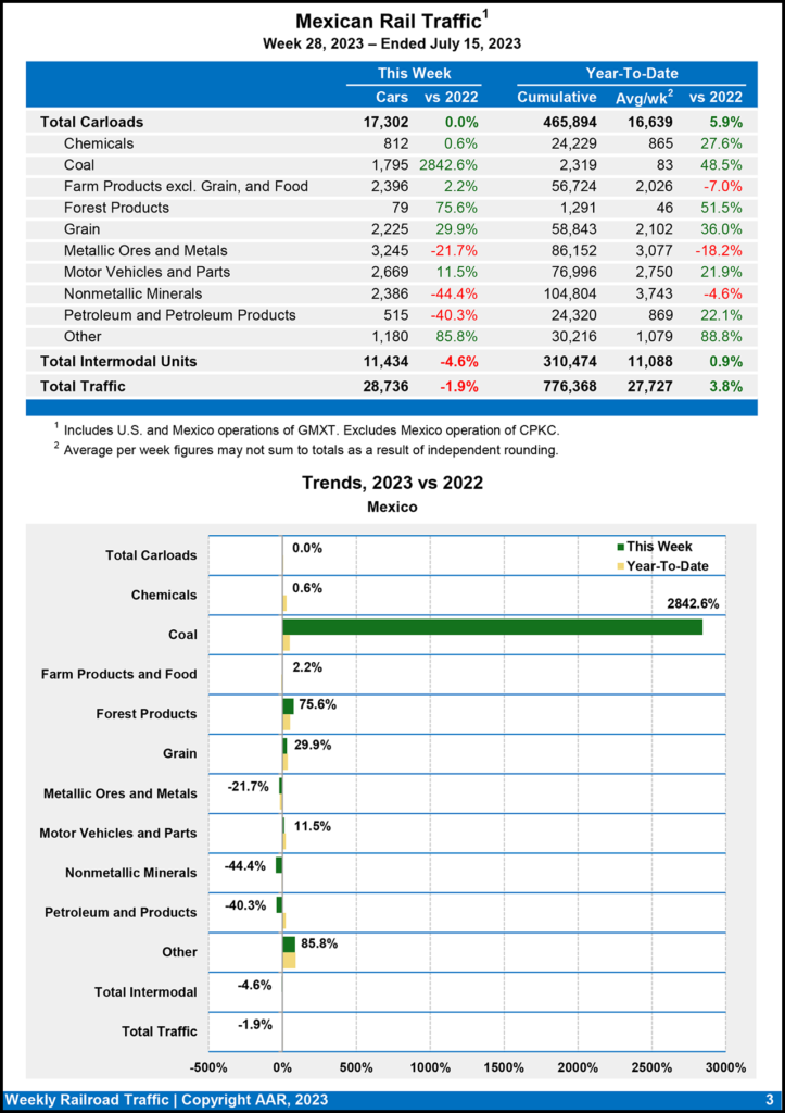 Mexican railroads reported 17,302 carloads for the week ending July 15, 2023, flat (0.0%) with the same week last year, and 11,434 intermodal units, down 4.6% from last year. Their cumulative volume for the first 28 weeks of 2023 was 776,368 carloads and intermodal containers and trailers, up 3.8% compared with 2022.