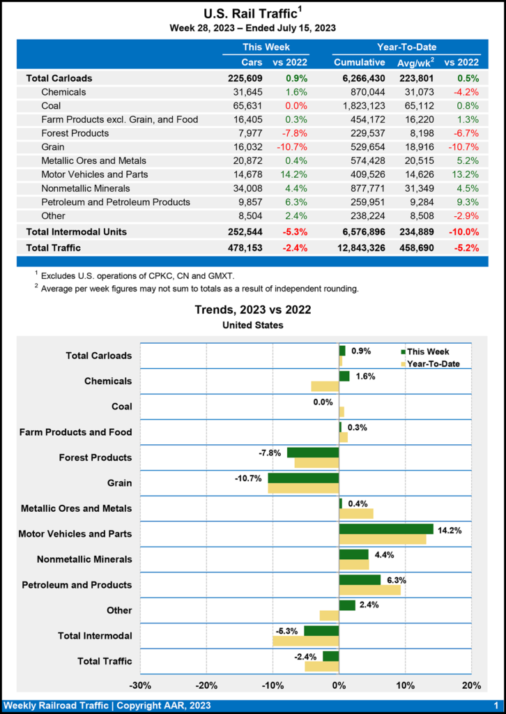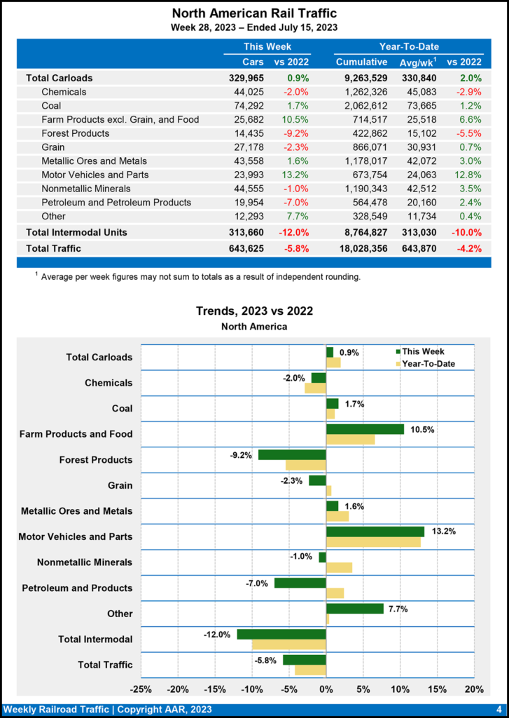 North American rail volume for the week ending July 15, 2023, on 12 reporting U.S., Canadian and Mexican railroads totaled 329,965 carloads, up 0.9% compared with the same week last year, and 313,660 intermodal units, down 12.0% from last year. Total combined weekly rail traffic in North America was 643,625 carloads and intermodal units, decreasing 5.8%. North American rail volume for the first 28 weeks of this year was 18,028,356 carloads and intermodal units, down 4.2% from 2022.