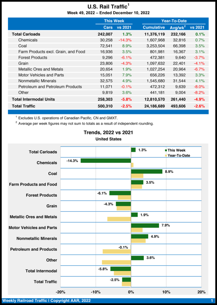 In Week 49 (ending Dec. 10, 2022), U.S. Class I railroads hauled a total of 500,310 carloads and intermodal units, comprising 242,007 carloads and 258,303 containers and trailers.