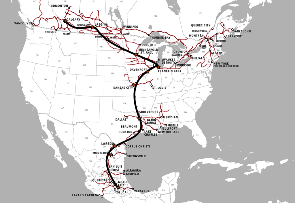The train will make 11 stops between Calgary and Mexico City: