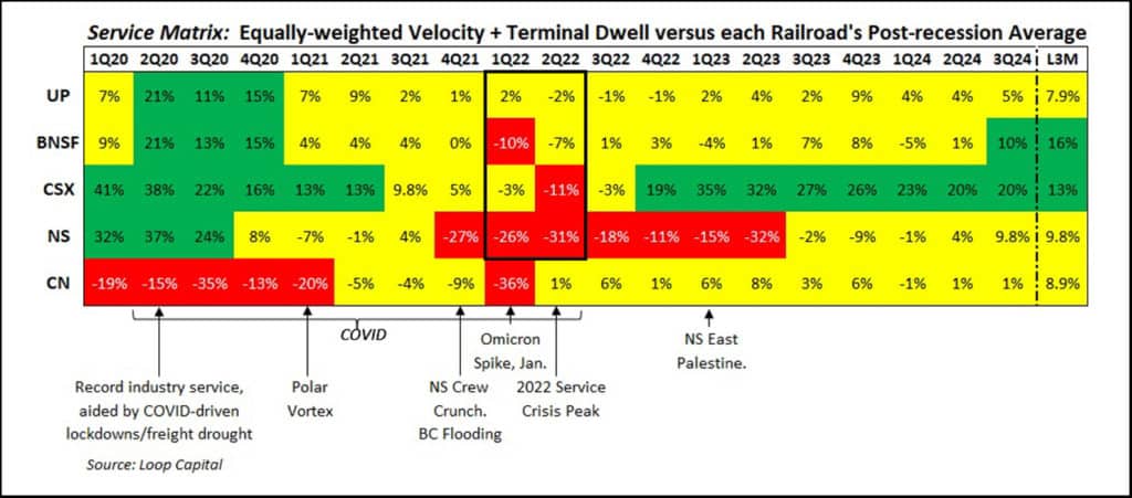 You can see the recent high- and low-water marks, with lots of green during the COVID lockdowns in 2Q20 due to the absence of volume pressure, and then the subsequent crew crunch in late 2021, causing the service crisis the following year (black rectangle). The last railroad to inflect out of that was Union Pacific exactly two years ago, and since then it has been a race for the railroads to get their houses in order, one piece at a time.