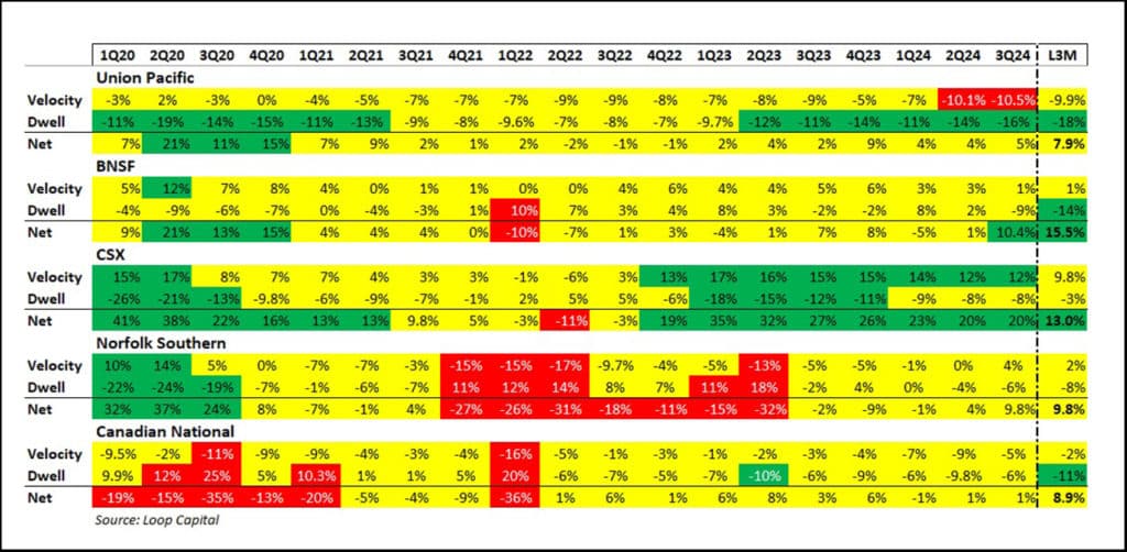 How are they doing it? If we unpack velocity and dwell in the chart below you can see that the primary driver has been lower dwell times at yards and terminals. Union Pacific, for example, has struggled with velocity in 2Q24 and 3Q24 due to weather and the 3Q24 international intermodal surge, but the 10% loss in speed has been more than offset (in the context of the chart, not necessarily the real world) by an 18% improvement in dwell vs. its post-recession average.