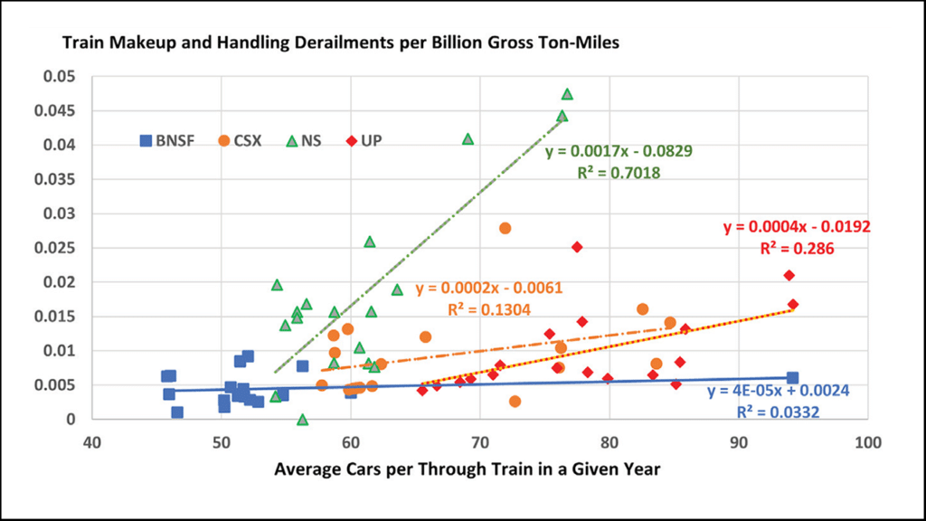 The committee produced the chart below consolidating a portion of its research into train length and the trend in derailments: