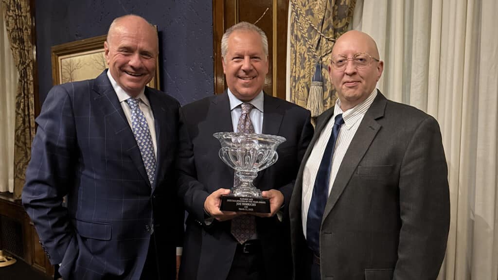 Railway Age 2025 Railroader of the Year Joe Hinrichs (center), CSX President and CEO, accepts the award from Railway Age Publisher Jonathan Chalon (left) and Editor-in-Chief William C. Vantuono.