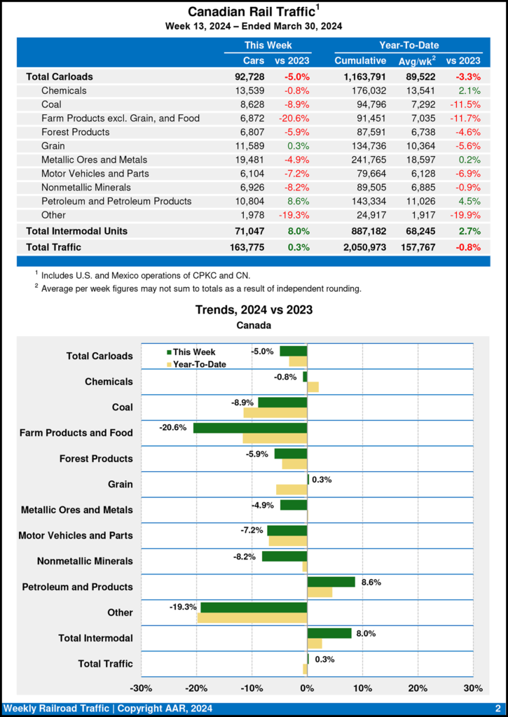 Canadian railroads reported 92,728 carloads for the week ending March 30, 2024, a 5.0% fall-off, and 71,047 intermodal units, an 8.0% increase from the same point last year. For the first 13 weeks of this year, they reported cumulative rail traffic volume of 2,050,973 carloads, containers and trailers, down 0.8%.
