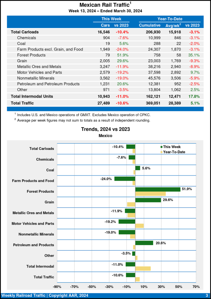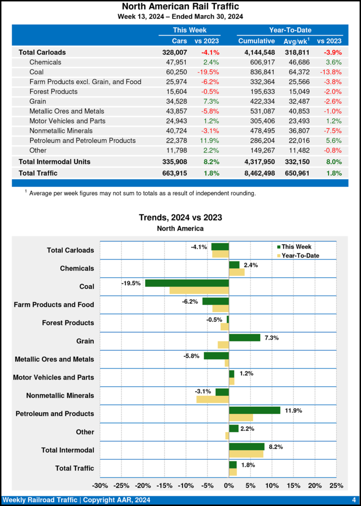 Total U.S. carload traffic for the first three months of this year was 2,773,827 carloads, down 4.2%, or 122,088 carloads, from the same period in 2023; and 3,268,647 intermodal units, up 9.1%, or 272,238 containers and trailers, from 2023.