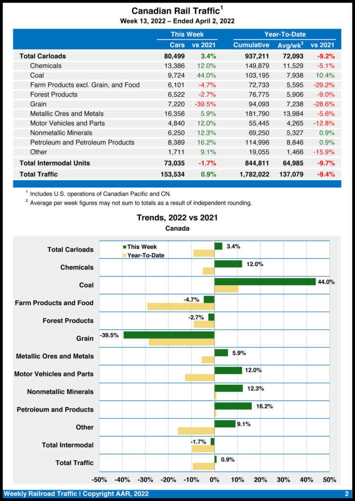 Canadian railroads reported 80,499 carloads for the week, up 3.4%, and 73,035 intermodal units, down 1.7% compared with the same week in 2021. For the first 13 weeks of 2022, they reported cumulative rail traffic volume of 1,782,022 carloads, containers and trailers, decreasing 9.4%.