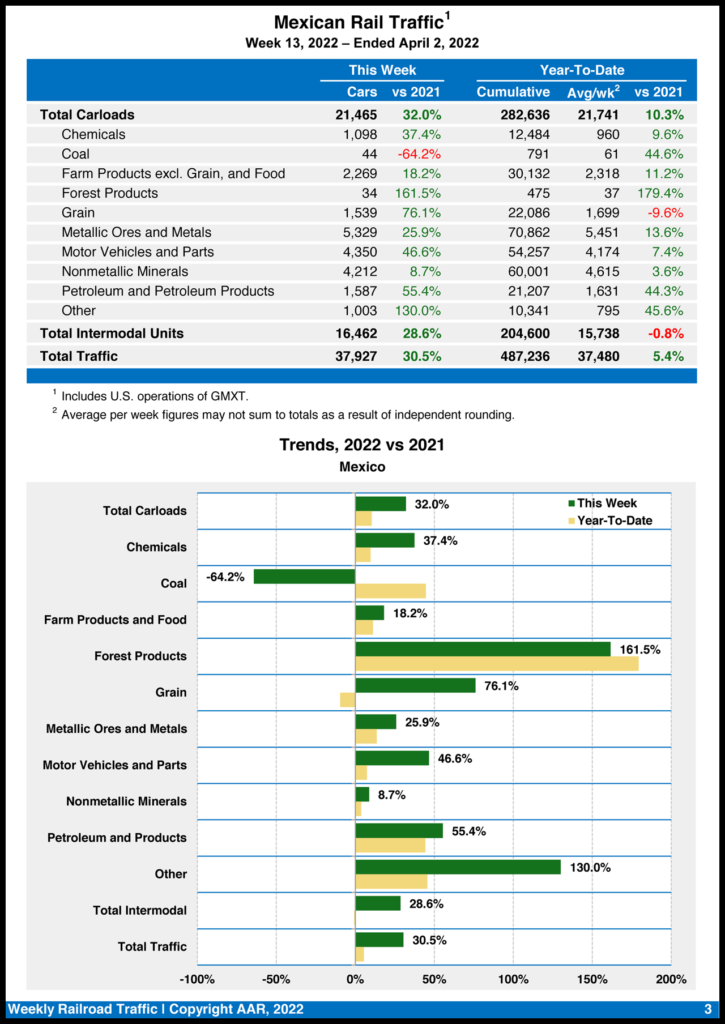 Mexican railroads reported 21,465 carloads for the week, rising 32% from the previous-year period, and 16,462 intermodal units, increasing 28.6%. Their cumulative volume for the first 13 weeks of 2022 was 487,236 carloads and intermodal containers and trailers, up 5.4% from the same point in 2021.