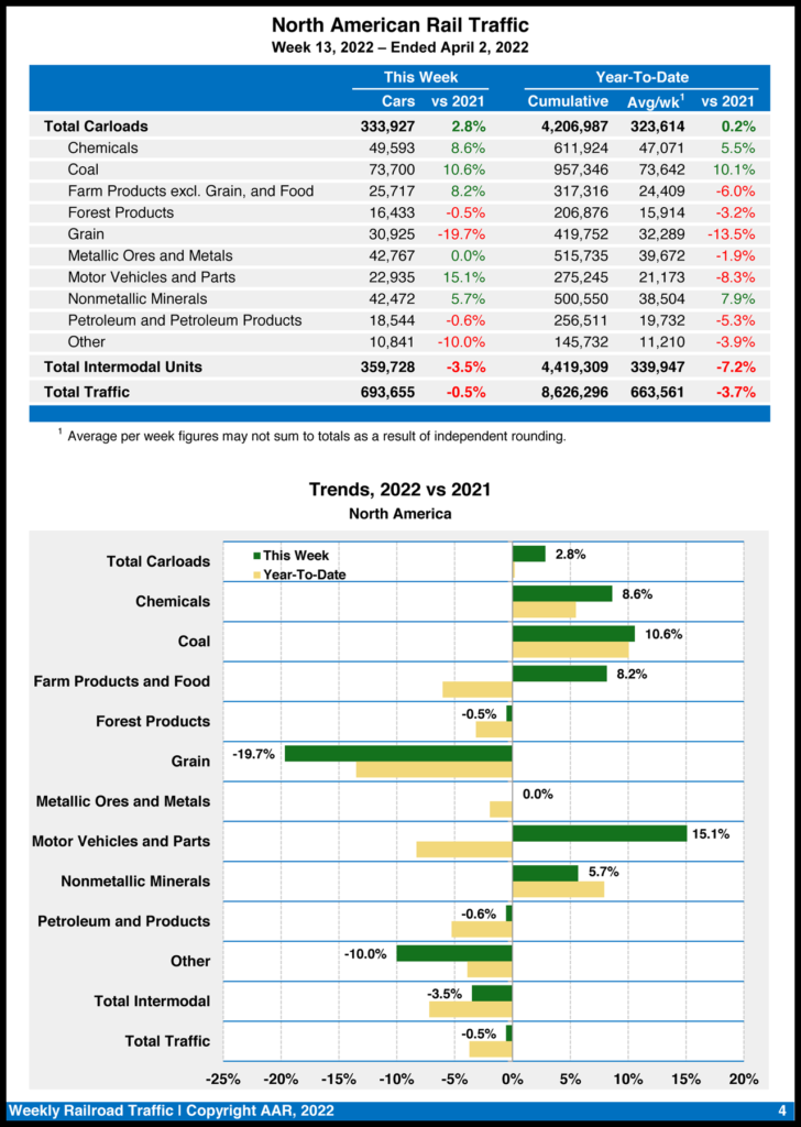 Excluding coal, carloads fell by 3,181, or 0.4%, in March 2022 from March 2021. Excluding coal and grain, carloads were up by 10,658, or 1.5%.