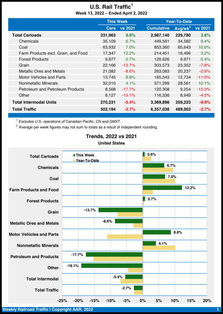 Total combined U.S. traffic for the first 13 weeks of 2022 was 6,357,038 carloads and intermodal units, a 2.7% decline from 2021.