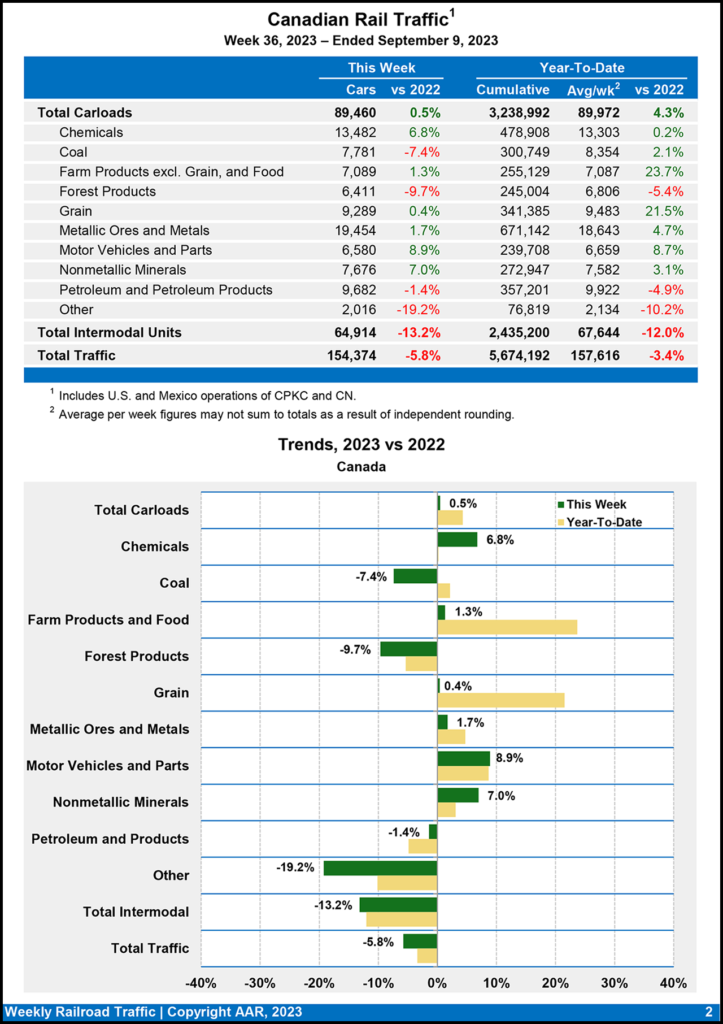 Canadian railroads reported 89,460 carloads for the week ending Sept. 9, 2023, up 0.5%, and 64,914 intermodal units, down 13.2% vs. the year-earlier period.