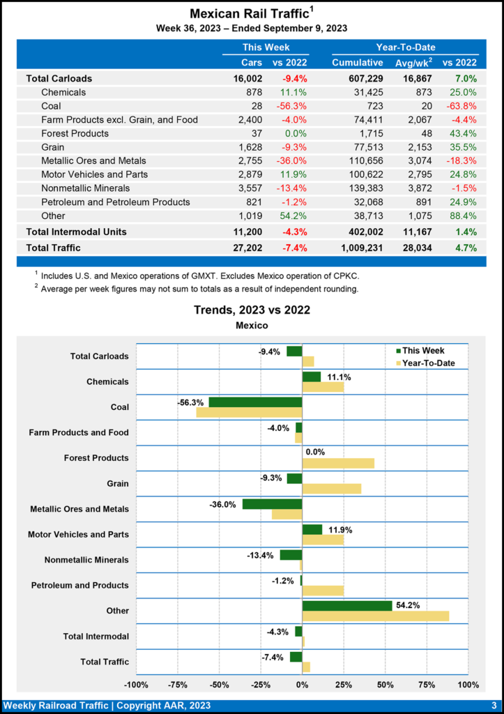 For the week ending Sept. 9, 2023, Mexican railroads reported 16,002 carloads, dropping 9.4% from the same point last year, and 11,200 intermodal units, decreasing 4.3%.