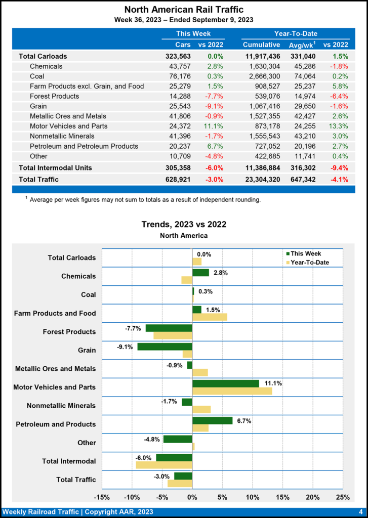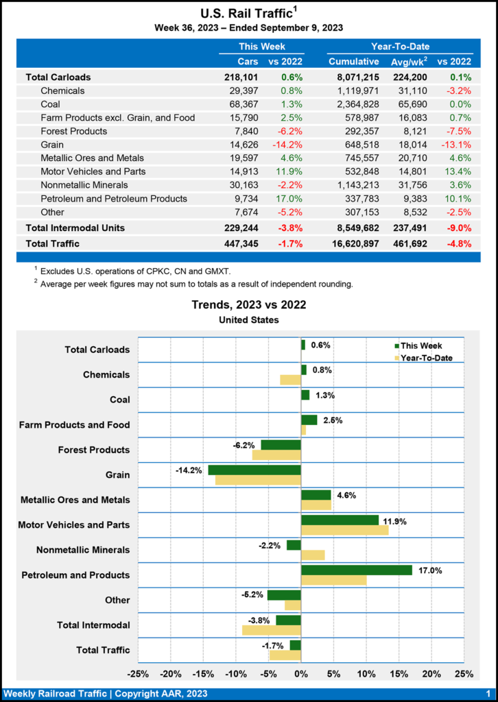 For the first 36 weeks of 2023, U.S. railroads reported cumulative volume of 8,071,215 carloads, a 0.1% rise from the same point last year; and 8,549,682 intermodal units, a 9.0% fall-off from last year.