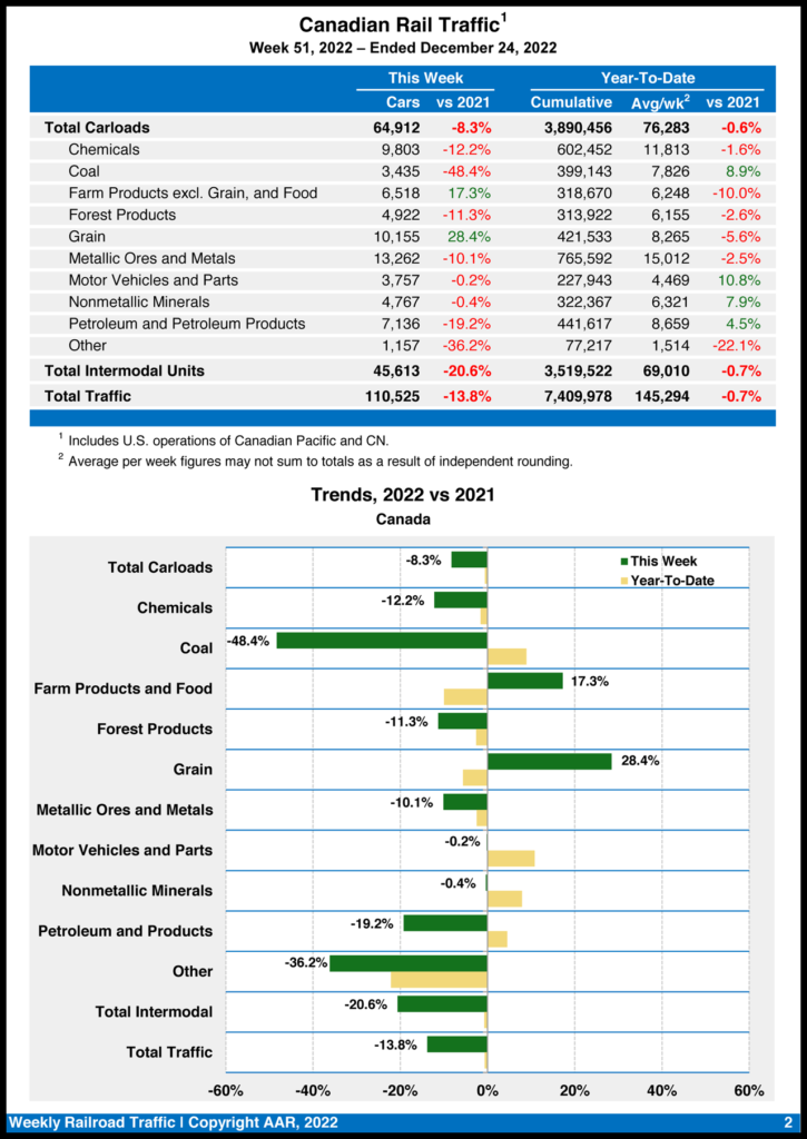 For the week ending Dec. 24, 2022, Canadian railroads reported 64,912 carloads, an 8.3% decrease, and 45,613 intermodal units, a 20.6% drop vs. the same point last year.