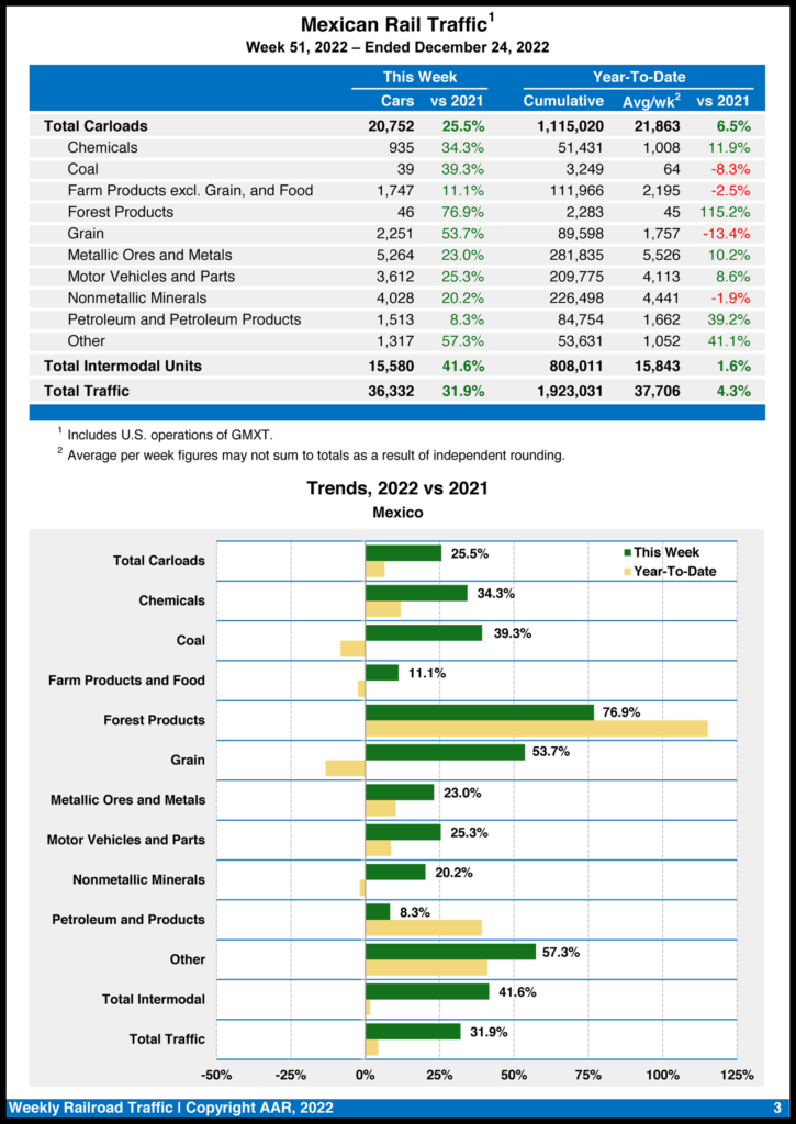 For the week ending Dec. 24, 2022, Mexican railroads reported 20,752 carloads, rising 25.5% from the same week last year, and 15,580 intermodal units, gaining 41.6%.