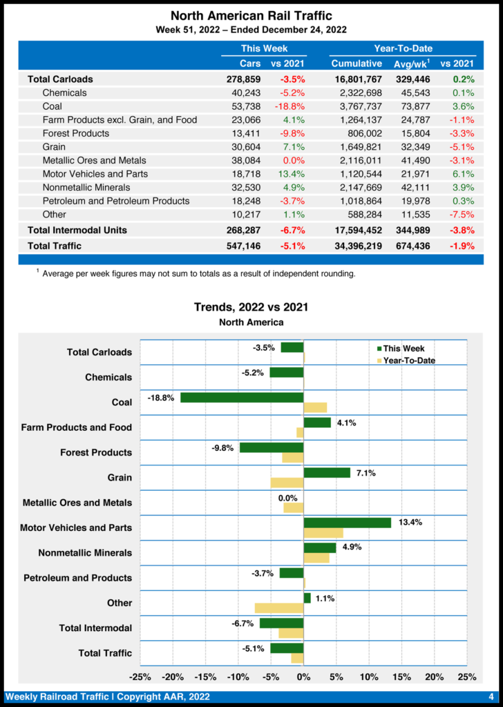 For the first 51 weeks of 2022, U.S. railroads reported cumulative volume of 11,796,291 carloads, down 0.1% from the same point last year; and 13,266,919 intermodal units, down 4.9% from last year.