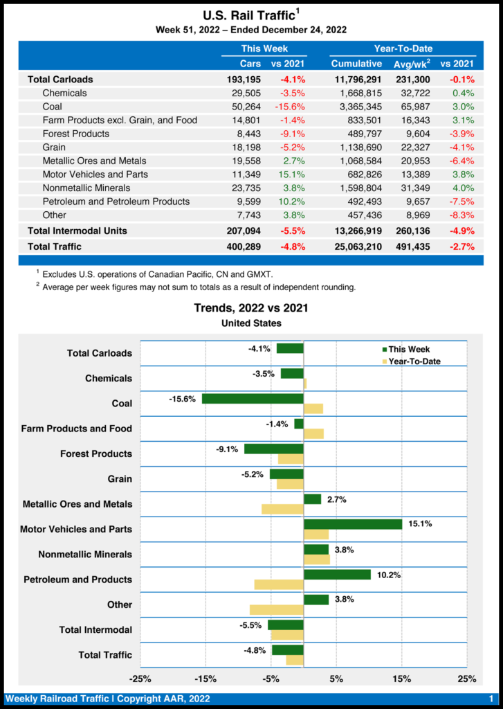 According to AAR, for the week ending Dec. 24, 2022, U.S. Class I railroads hauled a total of 400,289 carloads and intermodal units, falling 4.8% from the same week in 2021. This comprises 193,195 carloads—down 4.1% from the prior-year period—and 207,094 containers and trailers—down 5.5% compared with 2021.