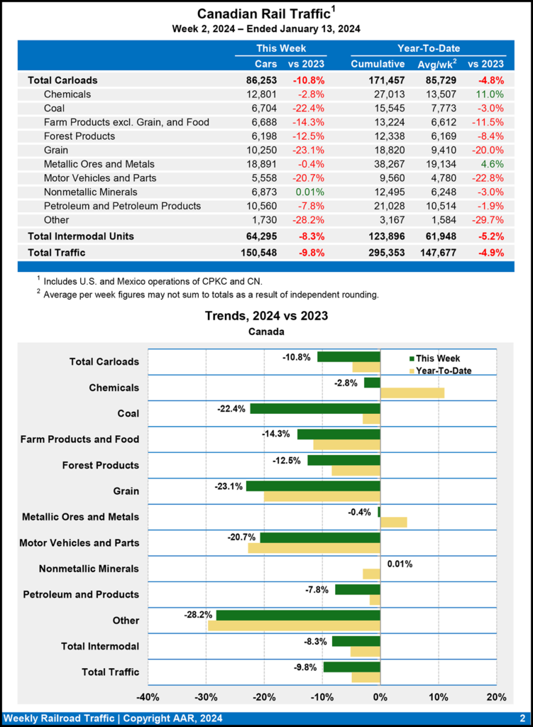 Canadian railroads reported 86,253 carloads for the week ending Jan. 13, 2024, a 10.8% fall-off, and 64,295 intermodal units, an 8.3% decrease compared with the prior-year period.