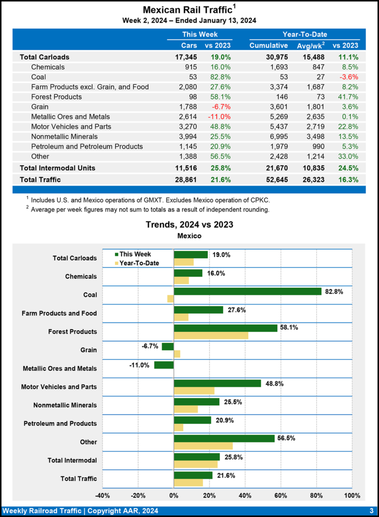 For the week ending Jan. 13, 2024, Mexican railroads reported 17,345 carloads, rising 19.0% from 2023, and 11,516 intermodal units, increasing 25.8%.