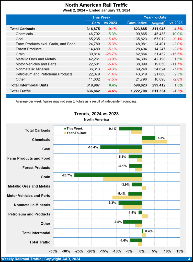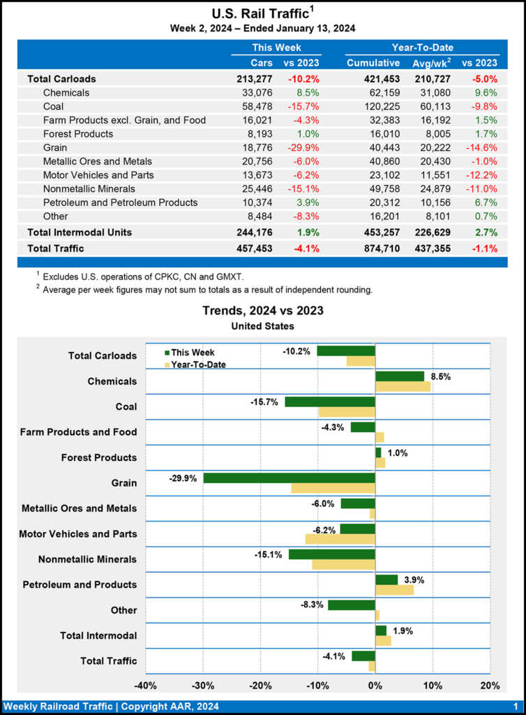 U.S. railroads for the first two weeks of this year reported cumulative volume of 421,453 carloads, down 5.0% from the same point in 2023; and 453,257 intermodal units, up 2.7% from 2023.