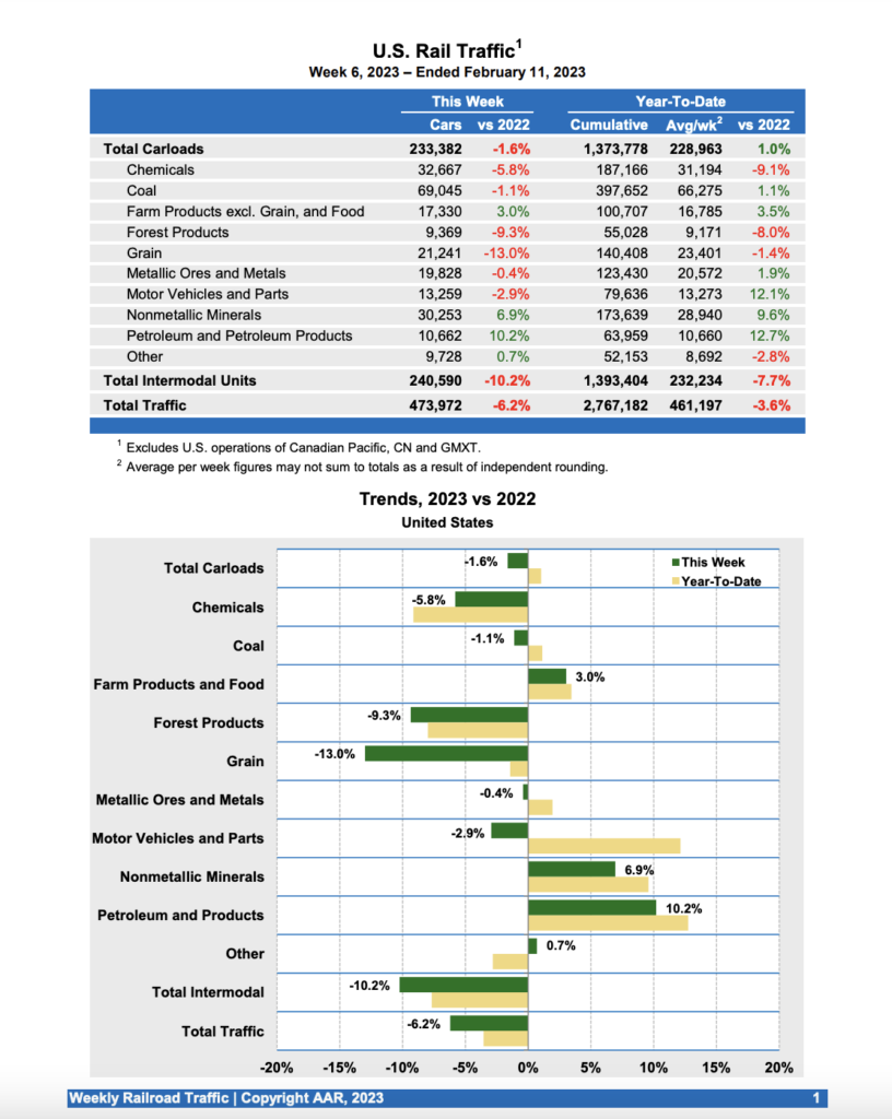 According to AAR, for the week ending Feb. 11, 2022, U.S. Class I railroads hauled a total of 2,767,182 carloads and intermodal units, a decrease of 3.6% compared to last year. This comprises 1,373,778 carloads, up 1.0% from 2022; and 1,393,404 intermodal units, down 7.7% from the prior-year period.