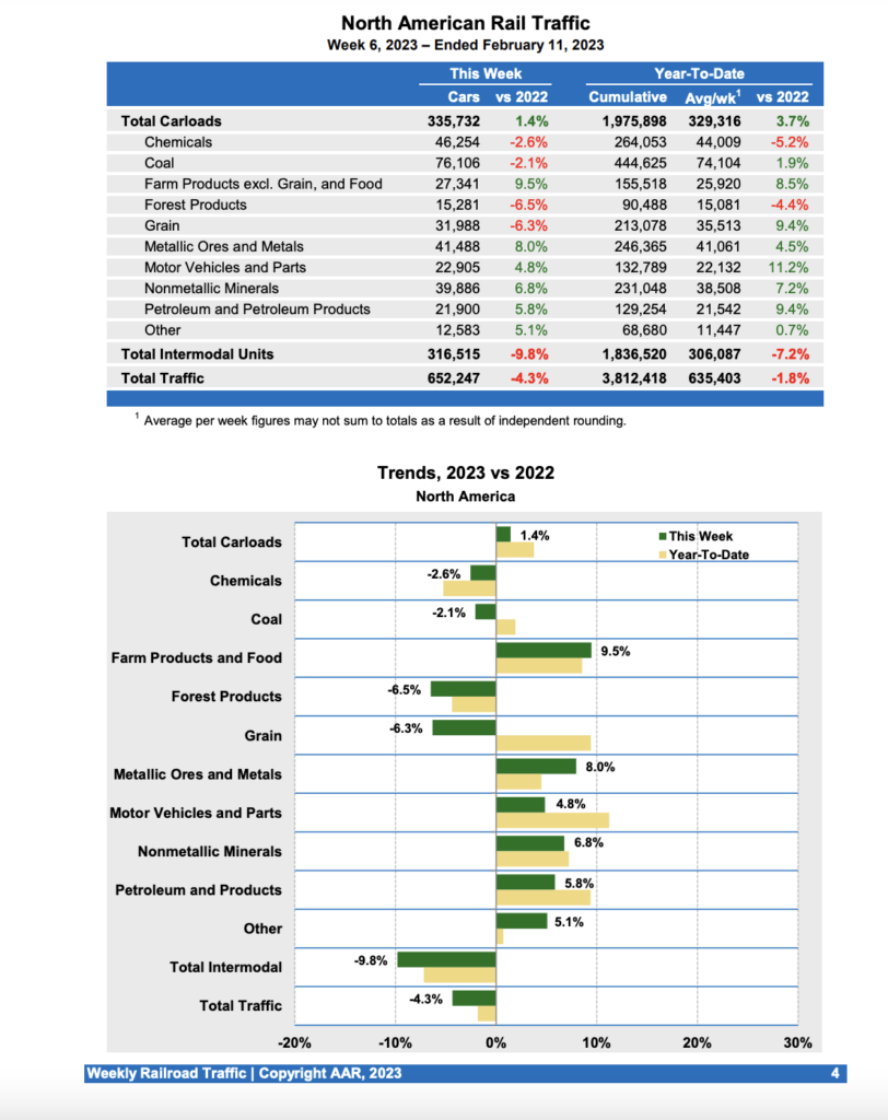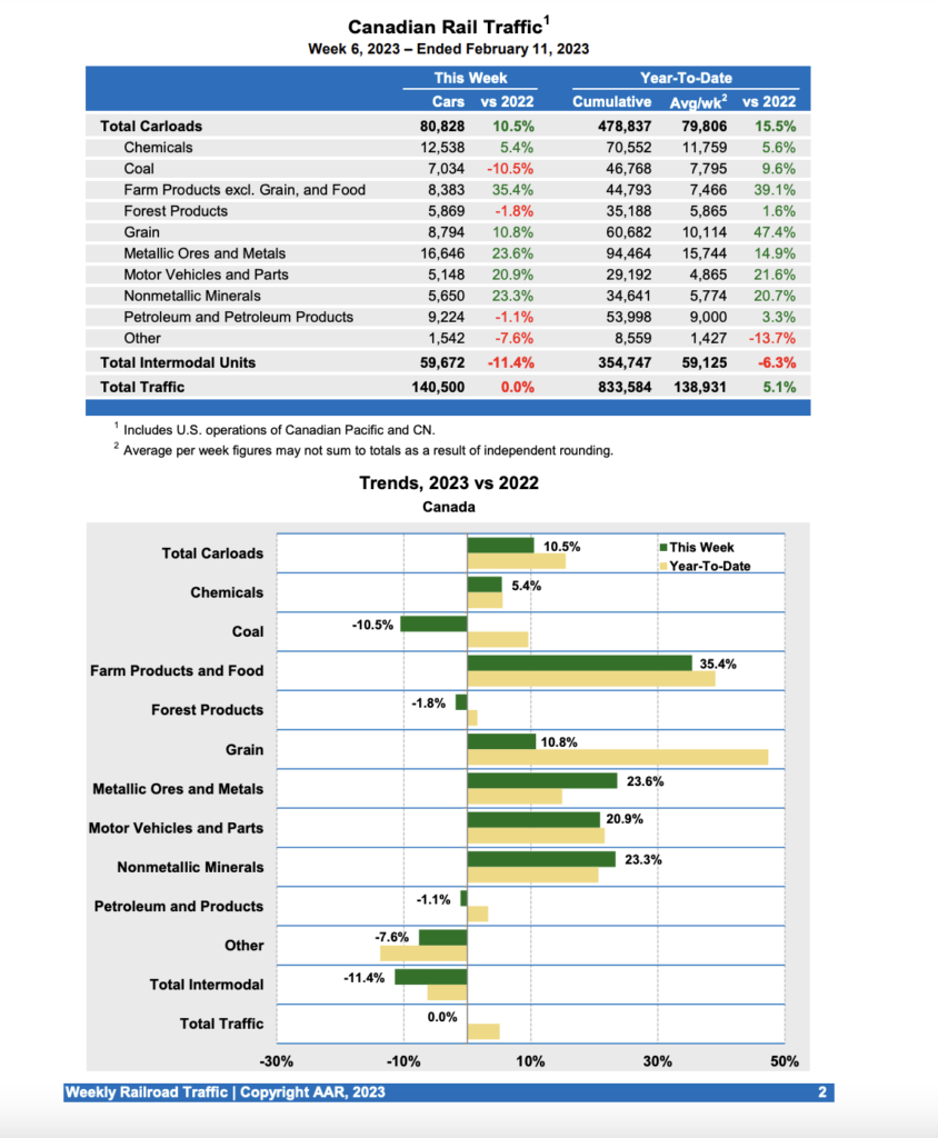 Canadian railroads reported 80,828 carloads for the week, up 10.5%, and 59,672 intermodal units, down 11.4% compared with the same week in 2022. For the first six weeks of 2023, Canadian railroads reported cumulative rail traffic volume of 833,584 carloads, containers and trailers, up 5.1%.