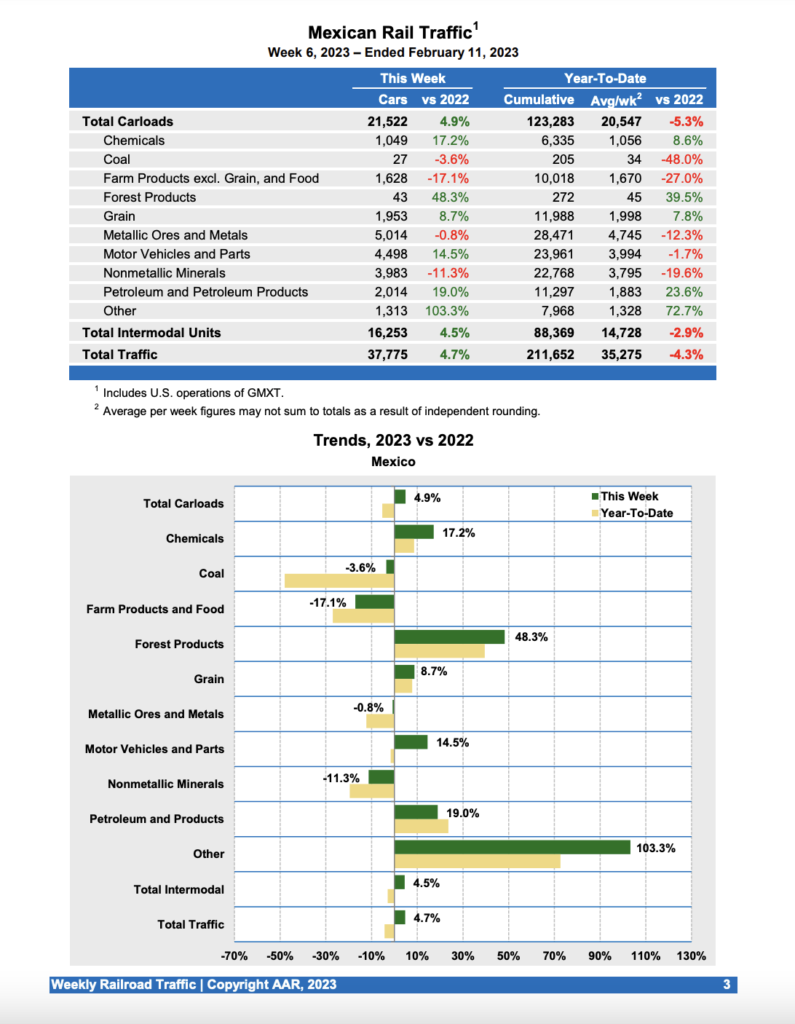 Mexican railroads reported 21,522 carloads for the week, up 4.9% compared with the same week last year, and 16,253 intermodal units, up 4.5%. Cumulative volume on Mexican railroads for the first six weeks of 2023 was 211,652 carloads and intermodal containers and trailers, down 4.3% from the same point last year.