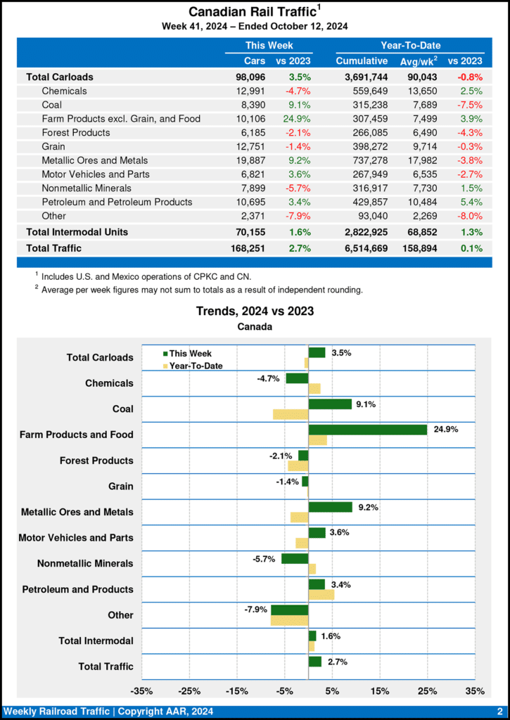 Canadian railroads reported 98,096 carloads for the week ending Oct. 12, 2024, up 3.5%, and 70,155 intermodal units, up 1.6% from the year-earlier period.