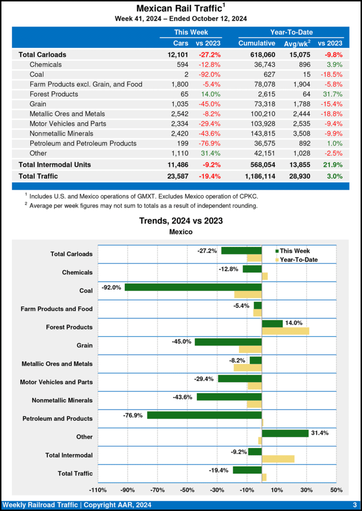 For the week ending Oct. 12, 2024, Mexican railroads reported 12,101 carloads, dropping 27.2% from the same week in 2023, and 11,486 intermodal units, falling 9.2%.