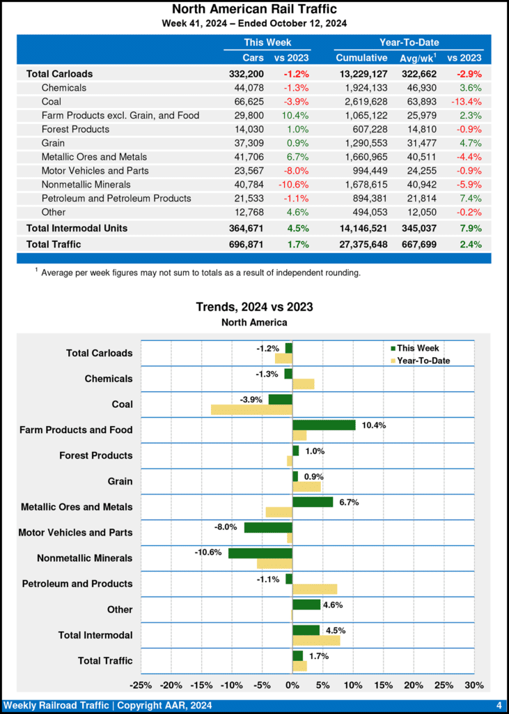North American rail volume for the week ending Oct. 12, 2024, on nine reporting U.S., Canadian and Mexican railroads totaled 332,200 carloads, dipping 1.2% from the same week last year, and 364,671 intermodal units, rising 4.5% from last year. Total combined weekly rail traffic in North America came in at 696,871 carloads and intermodal units, up 1.7%.