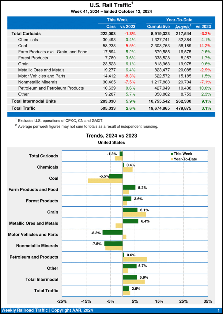 U.S. Class I railroads hauled 505,033 carloads and intermodal units during the week ending Oct. 12, 2024, up 2.6% from the same week last year, according to the AAR. This comprised 222,003 carloads, down 1.3% from 2023, and 283,030 containers and trailers, up 5.9% from 2023.
