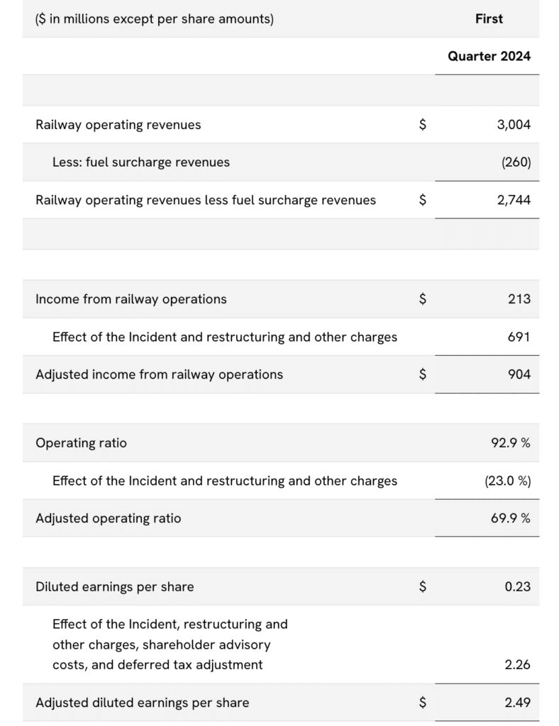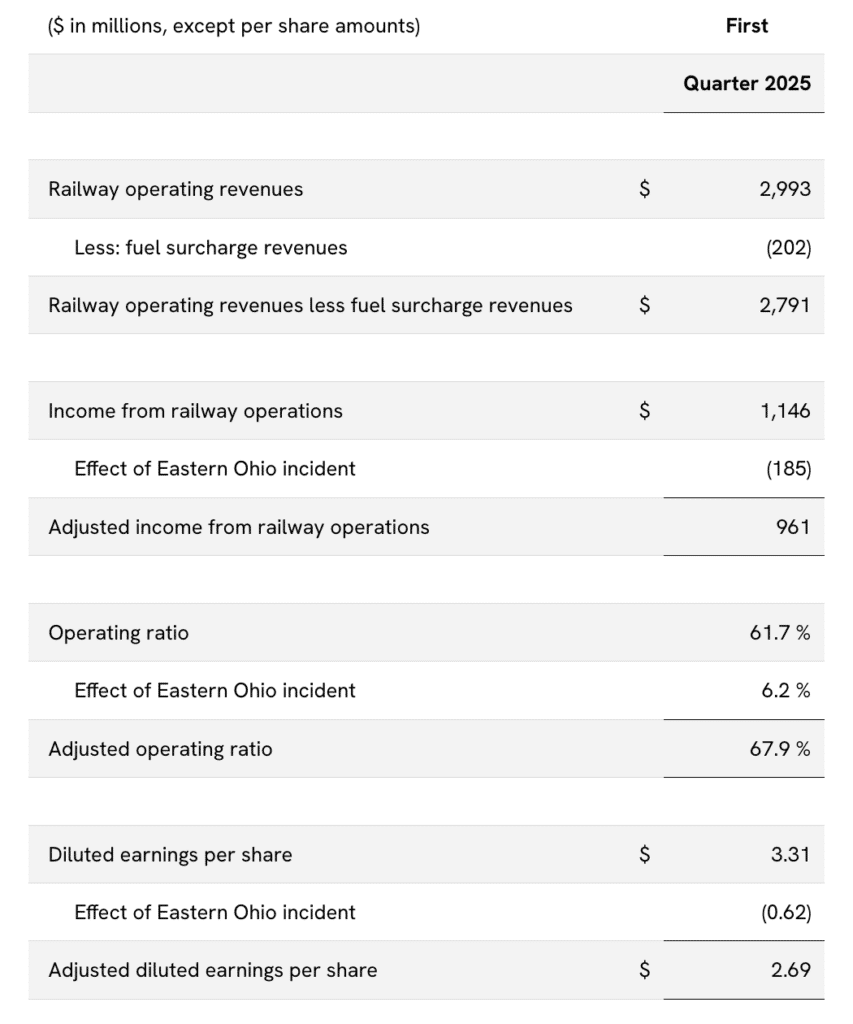 After adjusting the results to exclude the East Palestine, Ohio, derailment in 2023, first-quarter income from railway operations was $961 million, the operating ratio was 67.9%, and diluted earnings per share were $2.69.