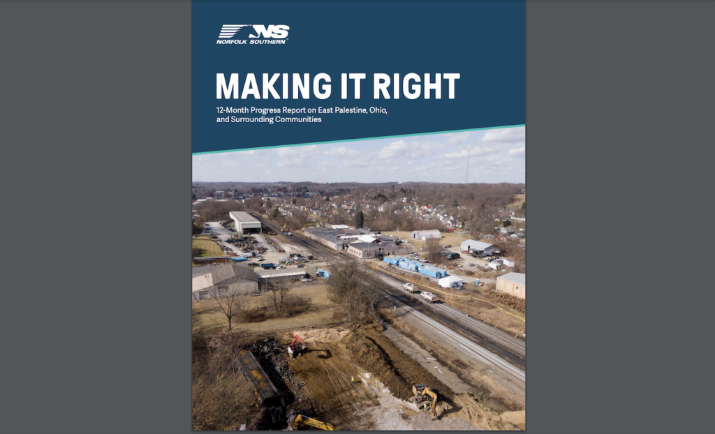 Norfolk Southern (NS) recently released a 12-month progress report detailing the Class I railroad’s efforts in East Palestine, Ohio, and the surrounding communities, following the Feb. 3, 2023, train derailment.