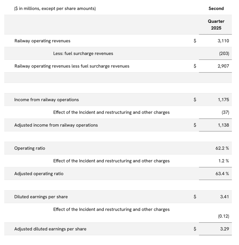- Excluding the impact of fuel surcharge revenue, which was lower compared to the prior year, railway operating revenues were $2.9 billion, up $122 million, or 4% compared to adjusted second-quarter 2024.