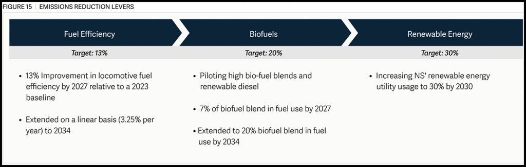 The Climate Transition Plan (download below) is slated to help NS achieve its science-based target of reducing GHG emissions intensity 42% by 2034, the Class I reported. The Plan identifies three key ways for doing so: a 13% improvement in locomotive fuel efficiency by 2027, a commitment to increasing renewable energy usage to 30% by 2030, and 20% consumption of low-carbon fuels (biofuels) by 2034. Fuel is said to account for more than 90% of NS’s scope 1 and 2 GHG emissions.