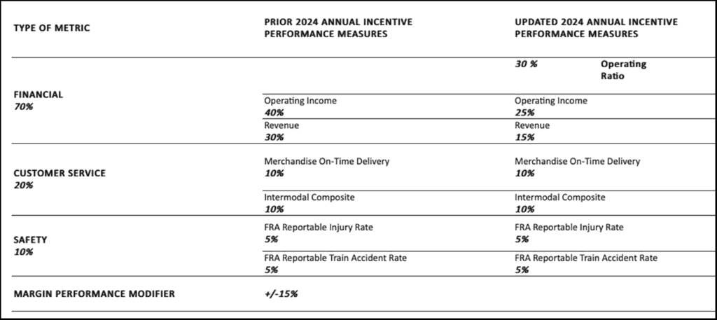 The NS Board of Directors Human Capital Management and Compensation Committee approved changes to the company’s 2024 annual incentive compensation plan. The changes include adding Operating Ratio (OR) as a performance metric to replace the “margin modifier” as part of the 2024 plan. “This will further align management incentives with the company’s financial and operational goals and strategy, which include safety, service, productivity and growth,” NS noted. “The 2024 OR targets also align with the improvements needed to achieve the long-term objectives of achieving a sub-60% OR in three to four years and delivering an industry-competitive OR.”