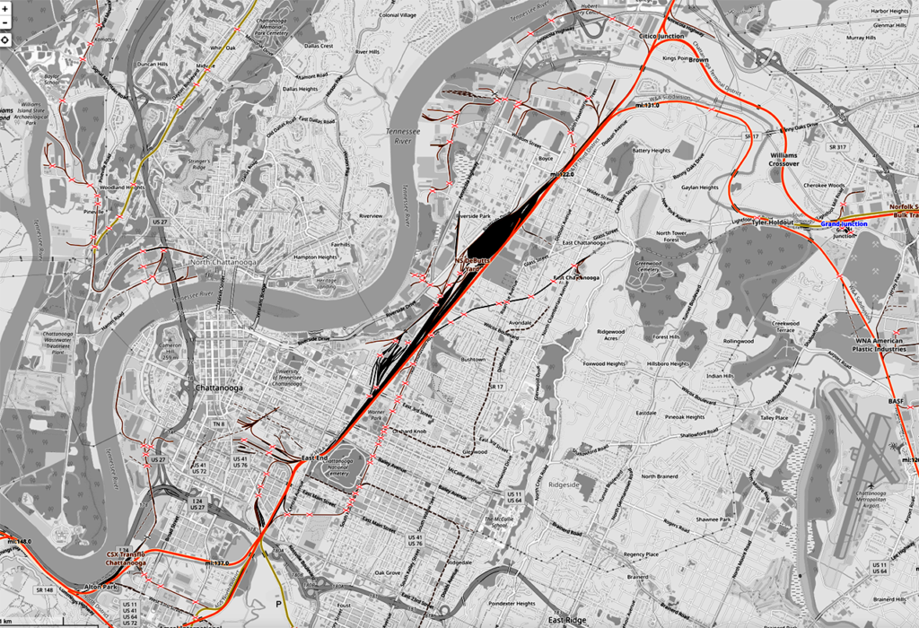 Orr has also adjusted near-term operating priorities, “streamlining processes and enhancing safety, productivity and service,” NS, by “executing a ‘Safety Blitz’ to reinforce best practices; assembling a task force and ‘war room’ in the Network Operations Center to assess network-wide asset utilization; developing a network ‘heat map’ to identify blockages and increase speed; and classifying two hump yards—Conway Yard in Pittsburgh, Pa. (above), and DeButts Yard in Chattanooga, Tenn. (below)—as ‘High Performance Terminals’ where he anticipates achieving 33% improvement in dwell time over the next 60 days at those locations.”