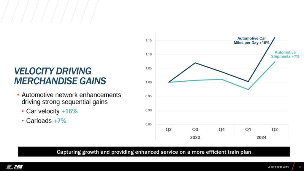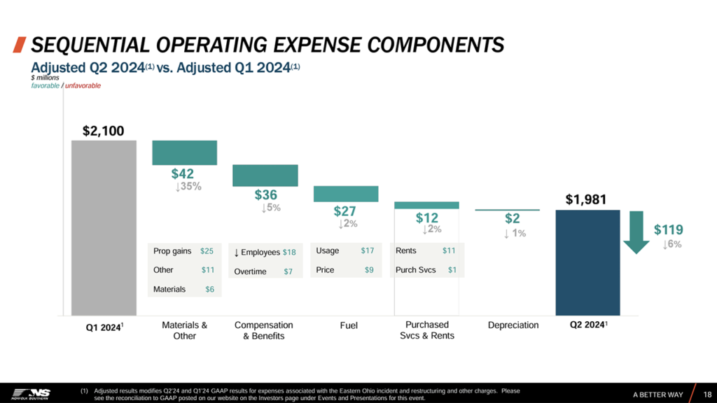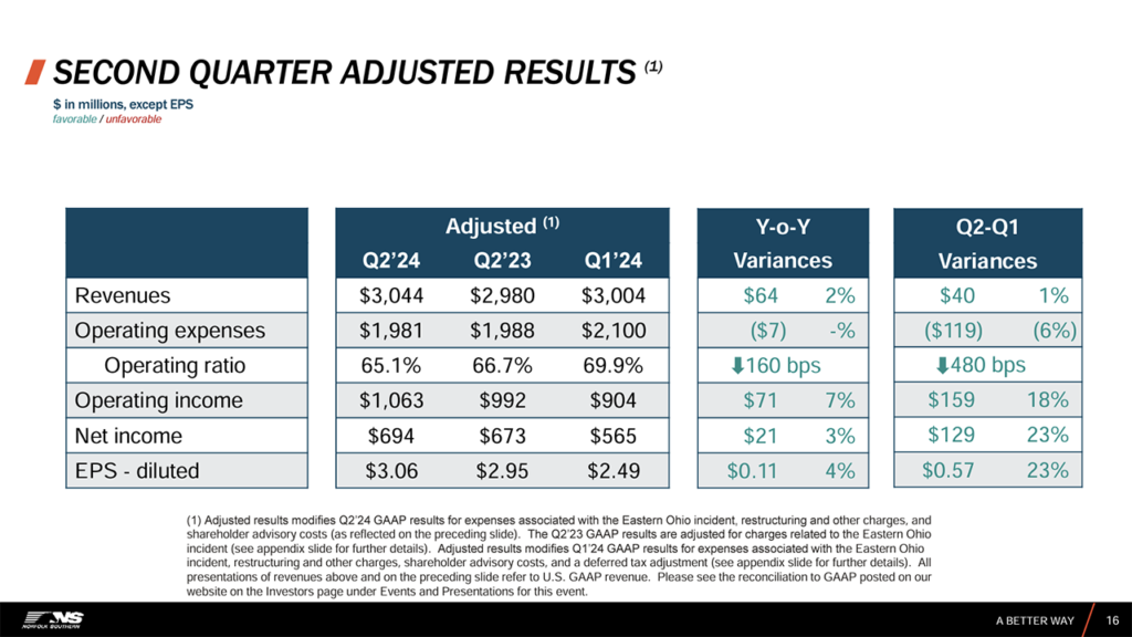- OR was 62.8% vs. 80.7% in second-quarter 2023. On an adjusted basis, the OR for this year’s second quarter was 65.1%, which NS said represents 160 basis points of improvement from second quarter 2023, which was 66.7%.