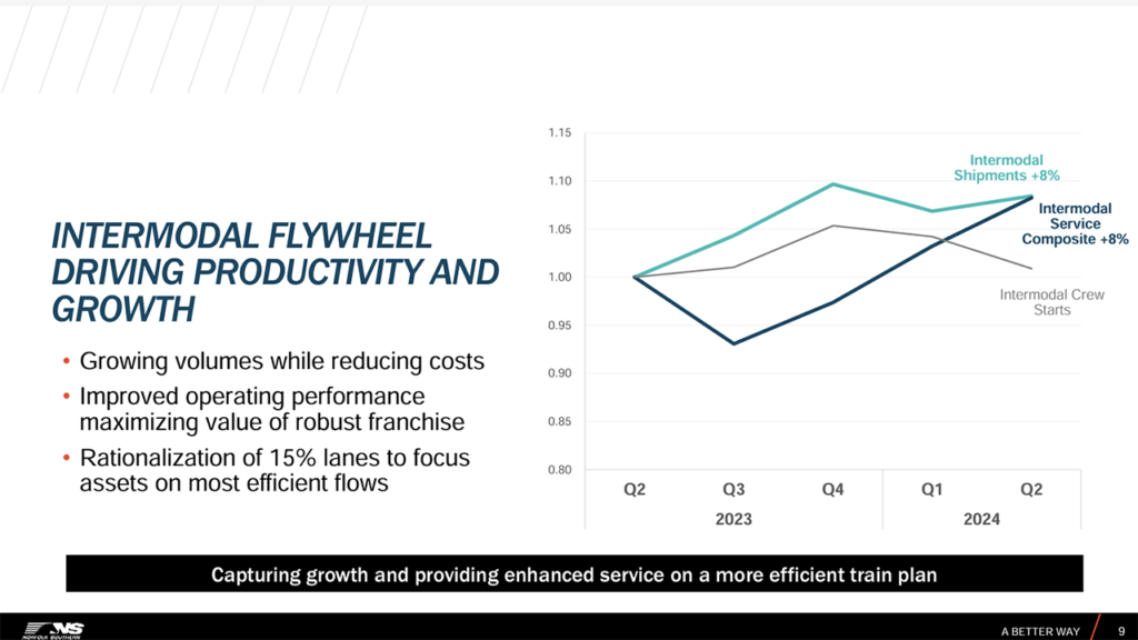 - Costs and the company’s operating plan were the main focus of the call on Thursday [July 25] as NS works to close the gap with peers, NS putting locos into storage (320+), reducing headcount, reducing overtime compensation (though new labor agreements should results in a +$25 million in labor into the third quarter), reducing purchased service needs, among others. NS is pulling approximately 15% of its intermodal lanes out of its network to drive efficiencies; these are smaller and less dense lanes, and shouldn’t reduce productivity even when demand returns. The new operating plan appears to be bearing fruit based on second-quarter results. Indeed, we are encouraged to see NS deliver on its cost initiatives so far; the runway remains long to achieve the 60% target, and we model 225 bps of OR improvement in 2025.