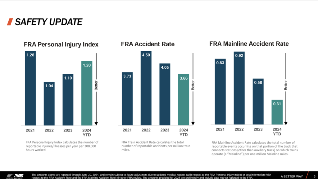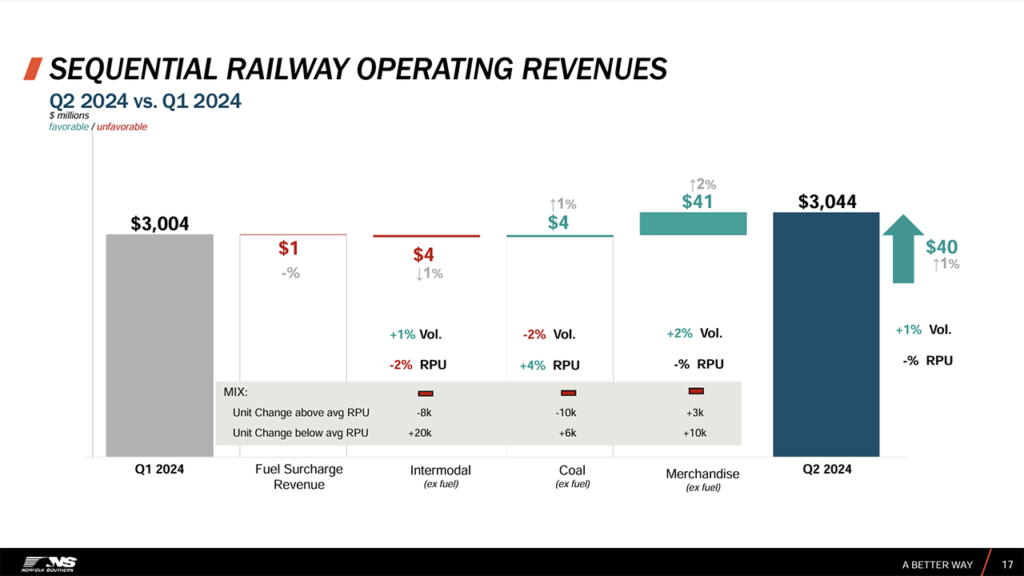 - Income from railway operations came in at $1.1 billion, an increase of $555 million, or 96%, compared with second-quarter 2023. Adjusting for the East Palestine derailment and restructuring and other costs, NS reported that income from railway operations was $1.1 billion, up $71 million, or 7%, compared with the same point last year.