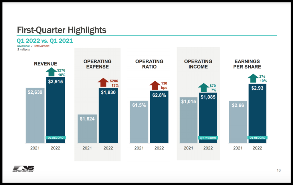 NS reported double-digit revenue and EPS growth for the first three months of 2022, noting that fuel and pricing gains “more than offset volume declines.”