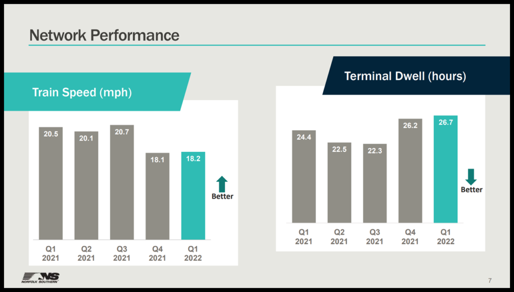 On the network performance side, train speed was 18.2 mph for first-quarter 2022, up from 18.1 mph in fourth-quarter 2021, but down from 20.7 mph in third-quarter 2021. Terminal dwell hours came in at 26.7 vs. 26.2 in fourth-quarter 2021 and 22.3 in third-quarter 2021.