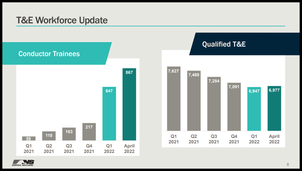 NS on April 27 released a first-quarter 2022 operating metrics report card: crew starts were down 5% from the prior-year period; active locomotives were up 1%; train weight and length were up 5% and 4%, respectively; and fuel efficiency was up 1%. Volumes were down 5%, and GTMs (gross ton-miles) fell 1% from the same point last year.