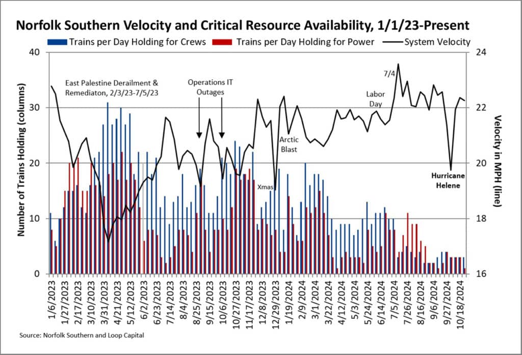 We now have three weeks of data post-Helene—enough time for any unwanted domino effects to show up—and our first chart below shows system velocity back to the start of 2023 (higher is better) and trains holding for crews and power (lower is better).