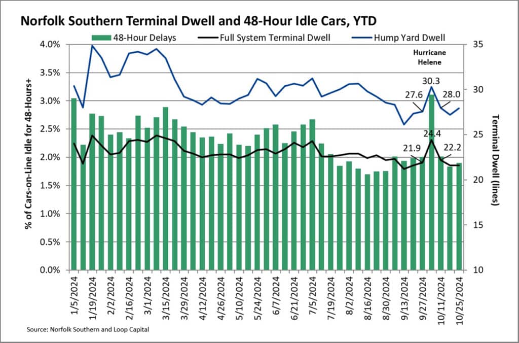 - Narrowing the focus to NS’s six hump yards we get 27.6, 30.3, and then immediately back to 28.0. Also note the earlier YTD low during the week ending 9/13.