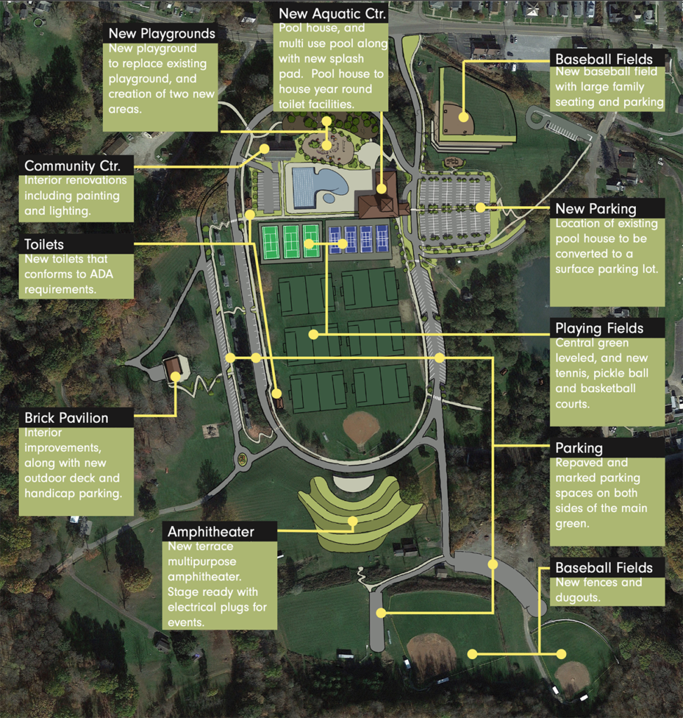 The park has served as a social hub for the village and is used for community gatherings, sporting events, fireworks and more. Designed to preserve the park’s history and natural beauty, the proposed plan includes essential upgrades and aesthetic improvements and will be completed over several phases.