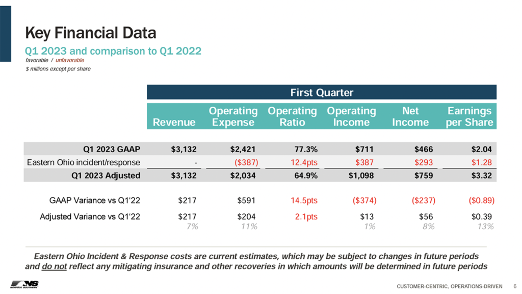 • Income from railway operations came in at $711 million and diluted earnings per share were $2.04, declines of 34% and 30%, respectively from first-quarter 2022, due to the derailment charge. Adjusting for the effects of the change, NS said, income from railway operations was $1.1 billion and diluted earnings per share were $3.32, improvements of 1% and 13%, respectively from 2022.