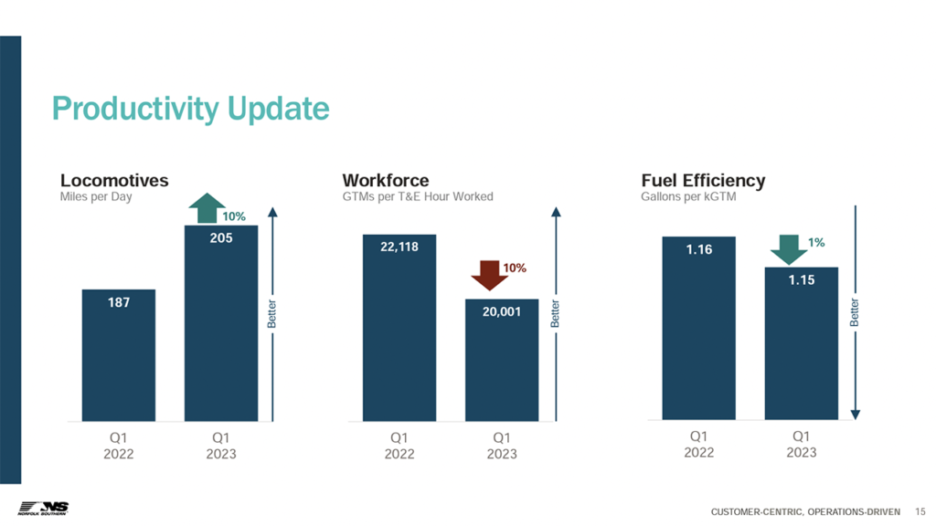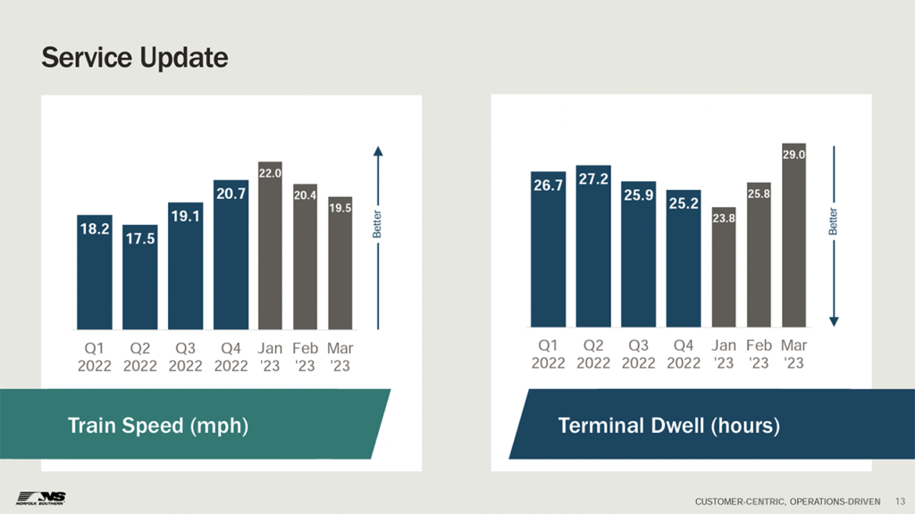 • “Service improvements became a casualty of the derailment in the first quarter with sequential worsening of fluidity metrics witnessed in February and March. East Palestine is located in an important corridor and is presently operating at reduced capacity. Normal operations on this line are expected to resume by June this year. NS also undertook a reassessment of train makeup procedures in the aftermath of the accident, resulting in near-term impacts on capacity provisions.