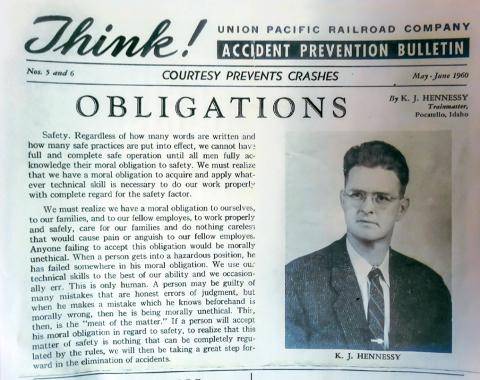 “Growing up in a railroad family, including seven older brothers who’d worked for the railroad, safety was instilled as part of our everyday life,” said Hennessy, sharing an entry from the May-June 1960 edition of Union Pacific’s Accident Prevention Bulletin called Think!, where her father, Kenneth wrote, “We must realize that we have a moral obligation to acquire and apply whatever technical skill is necessary to do our work properly with complete regard for the safety factor.”