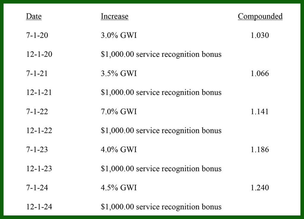 “This represents a 22.0% nominal wage increase during the term, a 24.0% compounded increase during the term, plus an additional $5,000.00 in service recognition bonus payments. During the term of the Agreement, the service recognition bonus payments are equivalent in value to an additional 0.9% GWI in the first year if carried over into the following years. Any wage recommendation must also take into account the other significant items in the package, both monetary and non-monetary. We are also recommending the following items for inclusion in the Agreement that affect its overall fairness, appropriateness, and value: